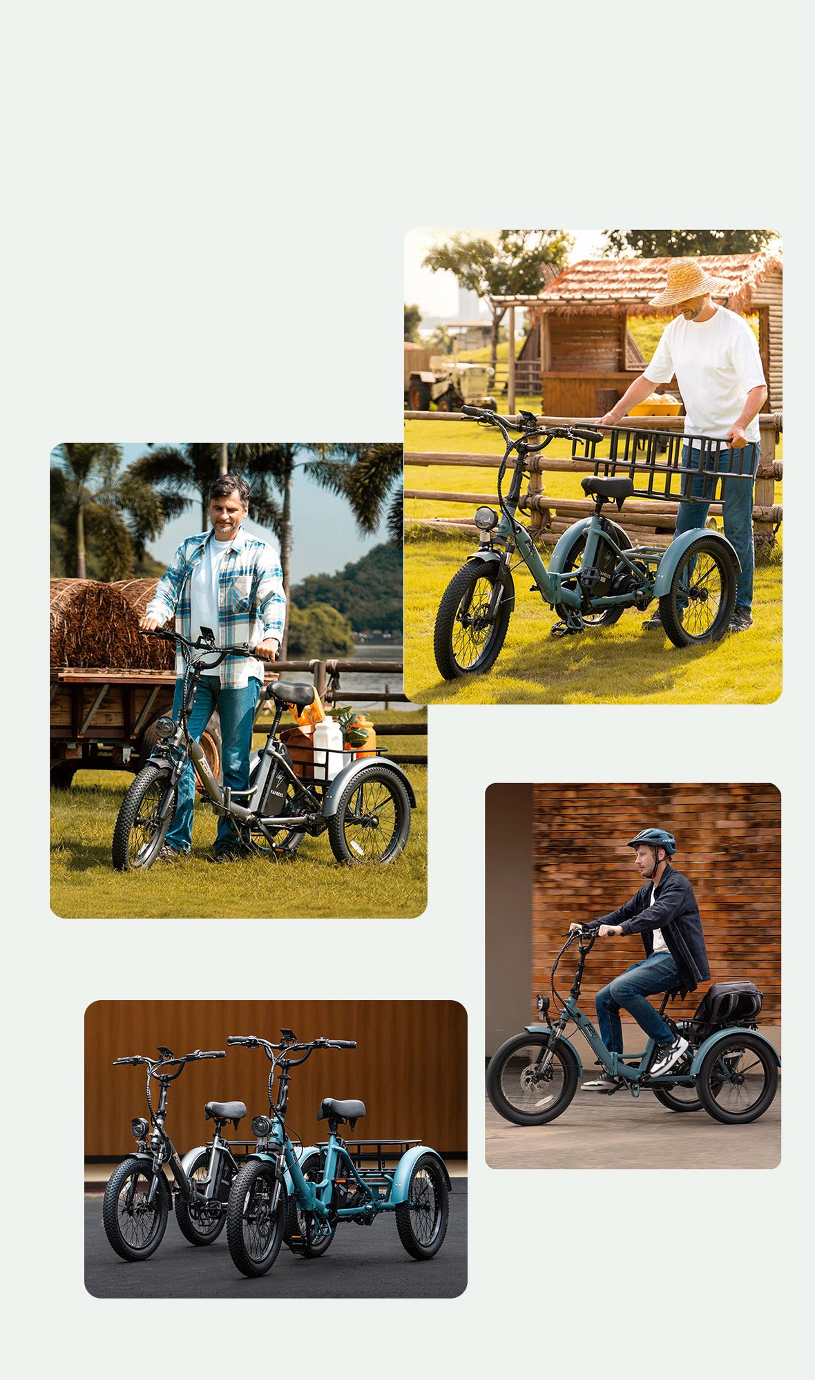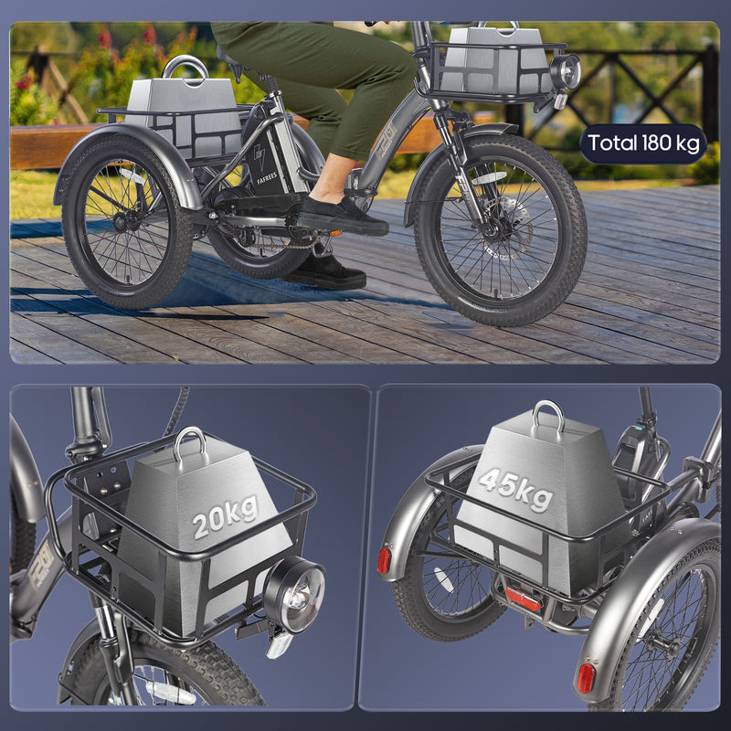 Stabilitet på 3 hjul, vardaglig användbarhet. F20 Mate har en 500 W motor, tjocka 20×3,0" däck och en robust bakre korg