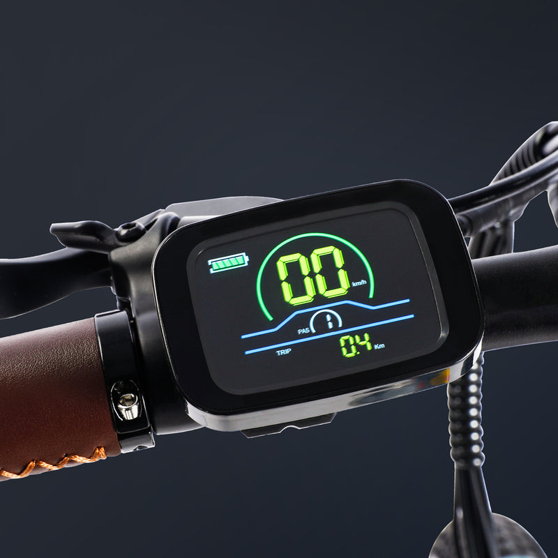 Vattentät LCD-display: Bakgrundsbelyst färgskärm med information om hastighet, batteri och utrustning samt gånghjälp för extra stöd.