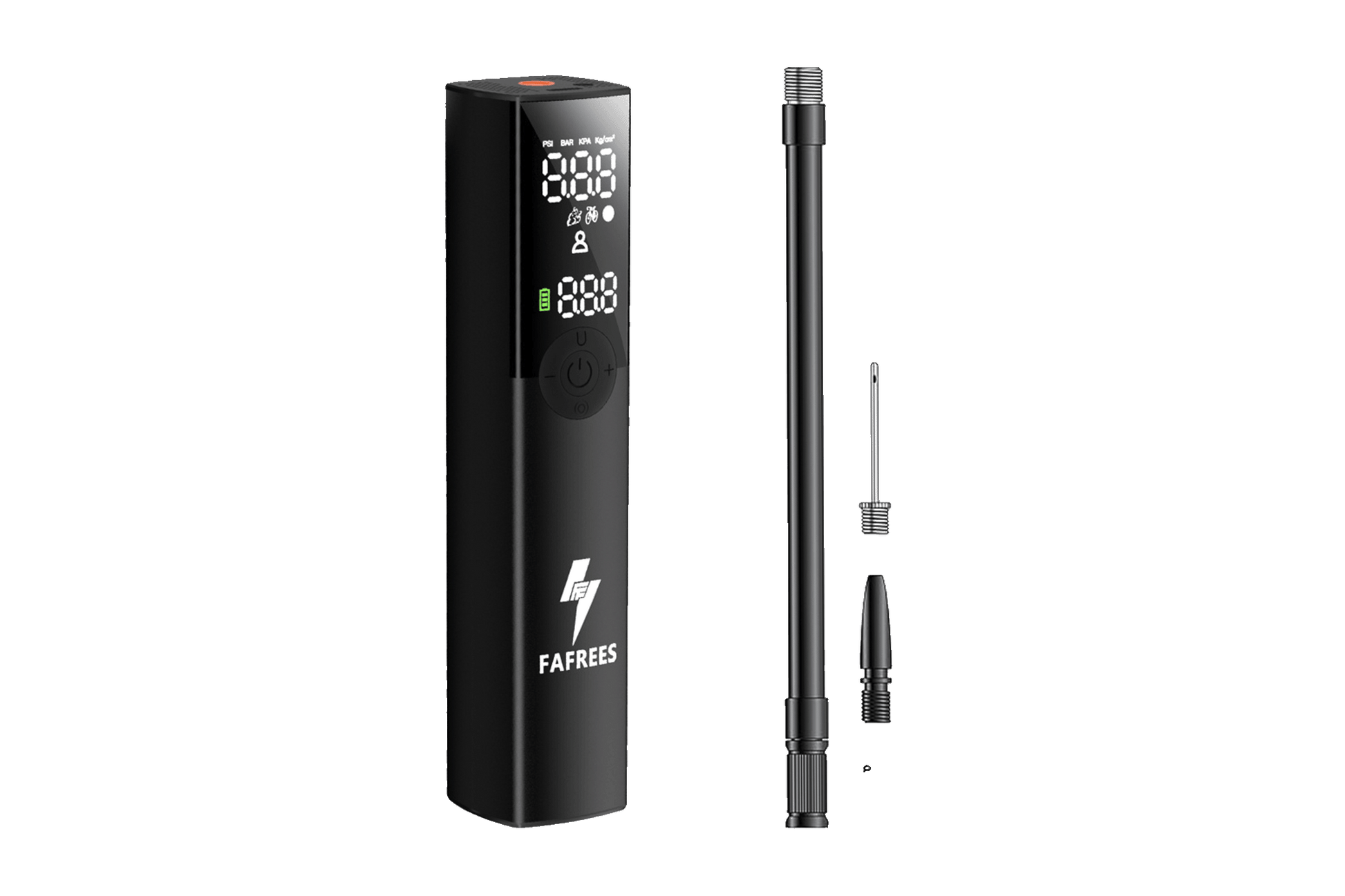 Levereras med en komplett uppsättning universalmunstycken, lämpliga för Schrader- och Presta-ventiler, basketbollar, fotbollar, uppblåsbara leksaker m.m.