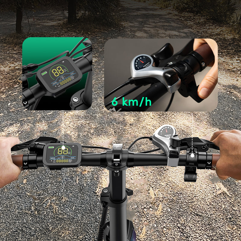 Vattentät LCD-display: Bakgrundsbelyst färgskärm med information om hastighet, batteri och utrustning samt gånghjälp för extra stöd.